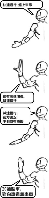 6.左手下垂,往前擺動: 快速通行,跟上車隊;