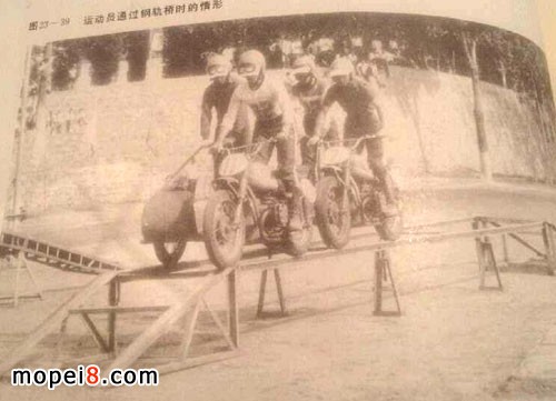 一般來講,在上橋的前半部應加大油門沖刺,后半部則應適當減油,以調整和控制通過速度。當感到車速不足時,應繼續加油直至后輪離開橋面;反之,可減油利用慣性離開橋面,摩托車躍起后,完全關閉油門,但落地前應及時加油,使之平穩離開。凡利用慣性速度離開橋面者,摩托車著地前駕駛員應做提把動作,以求后輪先著地。當車輛著地時由于慣性力向前的作用,加之車輛重心不在前后輪之間的平面內,會形成一個扭矩,故前輪擺動的力量很大,駕駛員必須用力把住方向把,不得使其前后擺動,否則,車輛不穩定。運動員通過斷橋時的駕駛姿勢,如圖23-42。