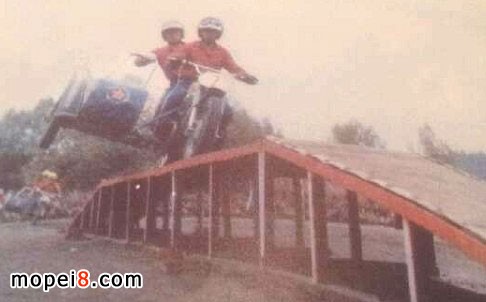 車輛進入上斷橋前的直線跑道時,應盡量由端線轉向,以備便有足夠的沖車距離。校正方向以后,迅速換上二擋,加油沖車。當前輪接近上橋時,由坐姿改為半蹲駕駛姿勢,上體前傾,兩膝夾緊油箱,兩臂把住方向把:與此同時,副手站在邊車后部中央偏左一側,兩手抓住邊車上部橫梁,兩膝微屈(防止摩托車落橋時由于顛震過猛而失誤),身體重心前移。