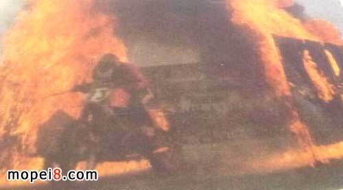 通過火墻的要領是:進入火墻前的直線跑道時,駕駛員可采用坐姿姿勢,迅速換上二擋,加油沖刺。當前輪接近火墻時,駕駛員臀部后移,上體前傾,兩臂把住方向把,低頭,加速通過。與此同時,副手應靠近主車一側,迅速下蹲,左手抓住主車后扒手,右手握住邊車豎梁的下部,低頭避火,如圖23-43所示。