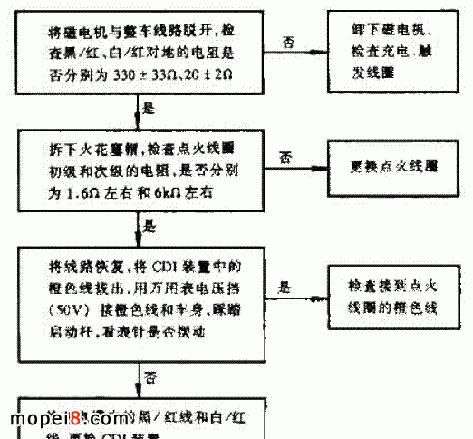 2. 故障原因( 1 )點火電源線圈及其引出線(黑 / 紅)斷路或短路。( 2 )觸發線圈及其引出線(白 / 紅)斷路或短路。( 3 ) CDI 點火裝置損壞。( 4 )電纜中黑 / 紅、白 / 紅或橙色線斷路或短路。( 5 )點火線圈損壞。( 6 )火花塞積碳嚴重。