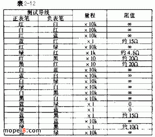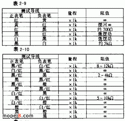 3. 用測試法進行檢查。用歐姆表測量明星 MX50 、雅馬哈 MA50 、鈴木 FA50 及鈴木 125 點火裝置上各引線間電阻值,應符合表 2-9 、表 2-10 、表 2-11 及表 2-12 所給出的值,否則應更換新件。