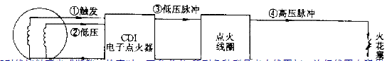 一般來說,次級線圈的工作電流則較小,一般使用線徑為 0.04 ~ 0.06mm 的漆包線繞制。對于與常用的電容放電式電子點火器相匹配的點火線圈,由圖 2-51 可知,初級線圈的一端與次級線圈的一端在點火線圈的內部與鐵心相連搭鐵接地(機架)。次級線圈的另一端由高壓電纜引出,因此點火線圈有三根引出線。即: ① 高壓線, ② 低壓線, ③ 地(機架)。一般的點火線圈由塑料外殼灌注環氧樹脂密封,因此點火線圈具有良好的防潮、抗震性能。摩托車點火系統出現故障的現象就是無高壓輸出,在圖 2-52 中所示的幾個環節中,環節 ① 的觸發,環節 ② 的磁電機低壓,環節 ③CDI 輸出的低壓脈沖的工作情況,均可以在打開摩托車點火開關、踩動啟動桿后由一般萬用表的交流電流擋測出。在 100mA 擋時指針偏轉說明圖 2-52 中點火線圈以左部分電路工作正常。如果火花塞仍不跳火,在排除火花塞故障后,故障焦點就集中在點火線圈上了。判斷點火線圈的好壞,有下述三種方法。