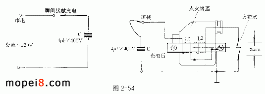 2. 找一個容量為 2 ~ 5μF 、耐壓為 400V 以上的電風扇或洗衣機用的啟動電容器,用其兩極在 220V 交流電源上瞬間接觸進行充電,此時應注意安全(圖 2-54 )。經一兩次瞬間刮擦,一般可充上 160V 左右的直流電,其極性是隨機的。然后,讓充好電的電容器與點火線圈的初級作瞬間搭接,搭接前讓點火線圈次級的高壓輸出端與點火線圈鐵心保持 5mm 左右距離。當充好電的電容器與點火線圈初級相碰瞬間,高壓輸出端與鐵心間會發出藍色明亮的火花并伴隨響亮的“僻啪”聲;這可以證明該點火線圈無匝間短路,可以使用。