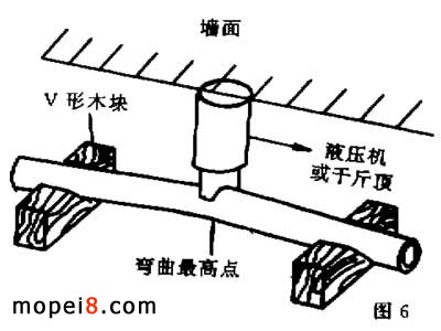 修理舊油封,首先將舊油封清洗干凈,再取出刃口內的上、下兩個彈簧,反時針旋轉,將彈簧從接頭處分開。視漏油情況和彈簧拉力的大小在彈簧的大頭方向剪去一節。連接彈簧前反時針旋轉幾圈,然后將小頭插入大頭內,順時針旋轉,把彈簧連接好,并細心地裝入油封口內。  3. 內叉管的校正  內叉管彎曲后,只要不太嚴重,可考慮校正。方法是將內叉管兩端墊上 V 型木塊,彎曲突出部位朝上。在液壓機頭部墊上一 V 型木塊后頂住彎曲突出點,慢慢加壓校直。校直時可用千分表測量,其擺差不應超過 0.2mm 。如無壓力機,可用液壓千斤頂,上方頂住一個固定點進行校直(見圖 6 )。