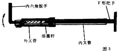 分解前減震器,使用內六角扳手卸下前減震器內的圓形內六角螺帽,拉出減震彈簧;將減震器油倒出,拔出防塵罩,取下油封上面的彈簧擋圈;使用專用工具 T 形把手(見圖 2 )頂住活塞桿頭部,用內六角扳手卸下減震器底部的活塞桿固定螺栓;將活塞桿和回位彈簧倒出來,最后拔出內叉管(見圖 3 )。