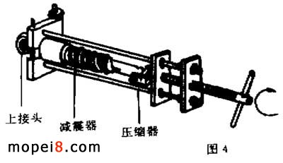 分解后減震器前先將彈簧放到最長以便壓縮;使用減震器壓縮器將減震器壓縮到一定位置,松開上接頭鎖緊螺母,卸下上接頭;慢慢放松壓縮器,減震彈簧伸至最長然后將其取下(見圖 4 )。