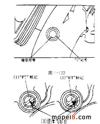 1. 要將曲軸旋轉到壓縮行程的上止點位置(對于多缸的發動機要使第一缸的活塞處于這個位置),如圖 1-130 所示。對 V 形缸,其前缸與后缸的上止點分別有標記(如圖 1-131 所示), F 為前缸、 R為后缸。