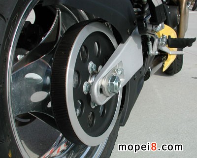 有時也使用軸主減速器。此系統通過傳動軸將功率傳遞給后輪。軸傳動非常流行,因為這種方式非常便利,且無需鏈條系統那么多的維護。但是,軸傳動更重,有時會導致摩托車尾部形成稱為頂軸的不必要的震動。
