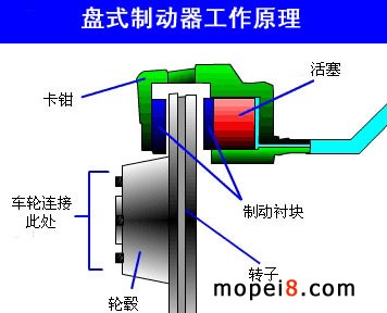 摩托車的前輪和后輪均有剎車。摩托車手用右邊把手上的手柄啟動前剎車,用右部腳踏板啟動后剎車。鼓式制動器在20世紀70年代經前常用,但目前大多數摩托車使用盤式制動器。盤式制動器由連接到車輪及剎車墊之間夾層的鋼質制動盤組成。摩托車手操作一個剎車時,通過制動管路控制的液壓使剎車墊擠壓制動盤的兩側。摩擦導致制動盤和連接的車輪放慢速度或停止。由于重復使用會磨損其表面,所以必須定期更換剎車墊。