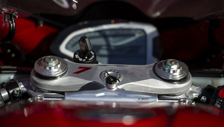 F4 RR的車頭部分無疑是一項高科技杰作:一對直徑為320mm的碟剎盤配置了當前技術最為先進的Brembo放射型卡鉗。錫材質的前叉表面非常光滑,使得Ohlins減震伸縮自如。減震系統(tǒng)的控制通過特殊的操控軟件來實現,讓車輛在絕大多數路況下都能獲得最佳的減震反饋。Marzocchi前叉和Ohlins減震器的優(yōu)秀性能在任何情況下都超乎駕駛者想象。