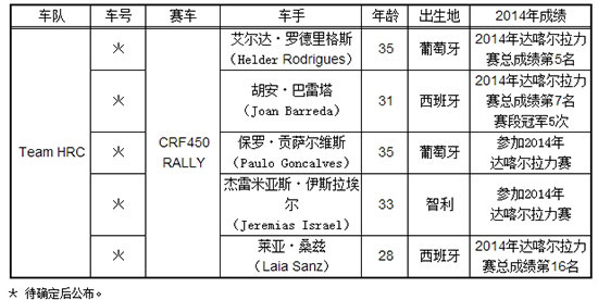 Honda將派出廠商車隊(duì)“Team HRC”和五名車手參加將在2015年1月4日鳴槍的“2015年達(dá)喀爾拉力賽”。除了參加去年達(dá)喀爾拉力賽的艾爾達(dá) 羅德里格斯、胡安 巴雷塔和保羅 貢薩爾維斯三名車手以外,具備一流水平的智利車手杰雷米亞斯 伊斯拉埃爾和攀爬摩托車手出身、素有“超級(jí)女郎”之稱并在2014達(dá)喀爾拉力賽上獲得女車手第一名的實(shí)力派車手萊亞 桑茲也將加入Honda車隊(duì),力爭(zhēng)贏得總成績(jī)冠軍。