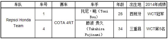 從2014賽季開(kāi)始,Honda派出廠商車隊(duì)“Repsol Honda Team”參加了世界攀爬摩托車錦標(biāo)賽(WCT)。2015賽季的參賽車手將由連續(xù)八年奪得此項(xiàng)賽事冠軍的托尼 鮑和2014賽季排名第五的日本車手滕波貴久擔(dān)綱,目標(biāo)是贏得車手九連冠和廠商十連冠。