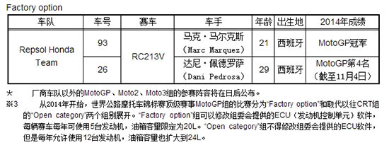 Honda將參加“Factory option”※3組的比賽,力爭(zhēng)蟬聯(lián)車手、廠商和車隊(duì)三冠王。代表車隊(duì)“Repsol Honda Team”出戰(zhàn)的車手是連續(xù)兩年折桂的馬克 馬爾克斯和目前排名車手積分榜第四的達(dá)尼 佩德羅薩。