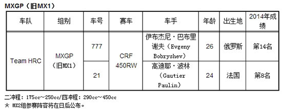 Honda將派出廠商車隊(duì)“Team HRC”參加世界越野摩托車錦標(biāo)賽頂級(jí)賽事MXGP(舊稱MX1)組的角逐。屆時(shí),將由伊布杰尼 巴布里謝夫和2014賽季MXGP排名第八的高迪耶 波林兩名車手出賽,力爭(zhēng)登上頒獎(jiǎng)臺(tái)。