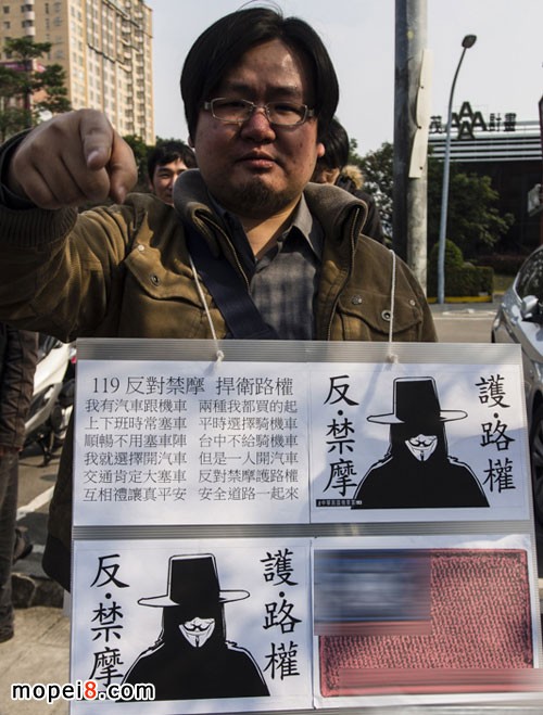 “護路權、反禁摩”,近3000名機車族集結臺灣大道高呼口號,最遠的從屏東騎來臺中市,百萬重機、古董車,還有一家3口共騎機車抨擊歧視機車族,學生和上班族戴“V怪客”面具,抗議禁摩是“違憲”。