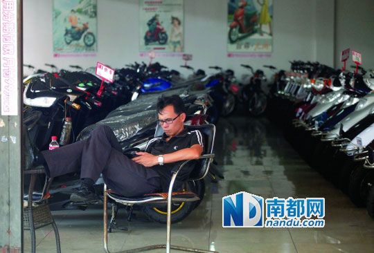 這座摩托城內(nèi)八成店鋪主告訴記者,近期銷售額已同比下降近半,月銷售額能達(dá)到50輛左右就足以“燒香拜佛”,更不要奢望2005年前后曾經(jīng)不可一世的“月售200輛”。“不是我們變了,是時(shí)代變了”,老范說著擰了輛摩托車的龍頭把手,并用濕毛巾擦拭去表面的灰塵。“這款已經(jīng)放置好幾年了,沒人碰過,臟了。”
