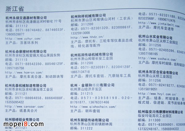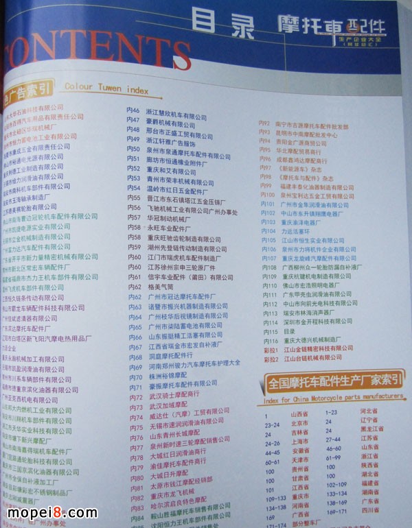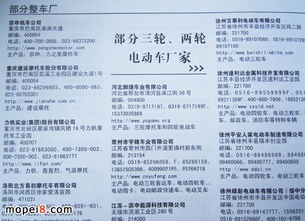 這兩年行業調整力度非常大,為了確保我們提供的信息準確性,我們本著寧缺毋濫的原則,不去圖虛的數量。目前摩托車與配件行業的不少經銷商是跨行業經營的,所以我們在本書中增加了部分摩托車整車廠、電動車生產廠、機動三輪車制造廠。所選的這些企業都是這個行業具有影響力的品牌企業,是為了大家在使用這本書時,獲取相關的延伸產業更多的實用信息。
