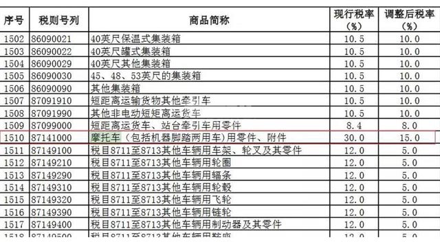 其中,第1510號是關于摩托車(包括機器腳踏兩用車)用零件、附件,從現行的30%稅率調整為15%