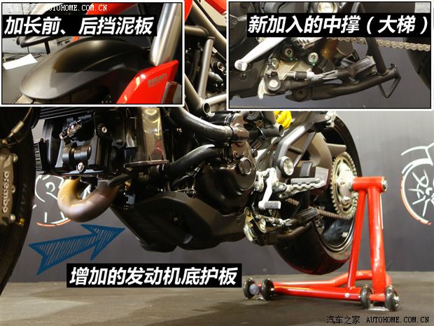 而其他的主要變化還有延長了的保養里程(增長到15000km,不過我認為沒有什么實際意義,因為摩托車在中國并非代步工具,1年騎1萬公里是很少見的,而每年換次機油是最起碼的了);DESMO氣門調節從15000km延長到了30000km;增大的油箱(從12.5升增長到16升,這項改變是極好的!頻繁加油對我來說是很煩的一件事。而且長途旅行能達到的范圍也更遠了)。