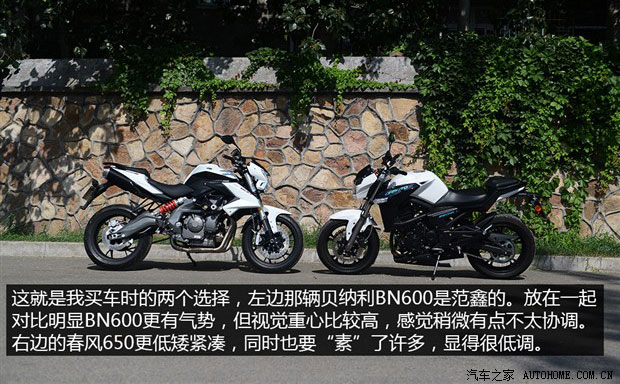合法上路是必須的,前后花了一個多月的時間增駕摩托駕照,接下來就是選車了。我的邏輯很簡單,因為興趣愛好而買,不考慮實用代步,所以要買大排量。同時對駕駛大排量摩托車沒什么經驗和感覺,無法一步到位選擇真正適合自己的車,就先買輛入門車型練手。最終錢江貝納利BN600(簡稱BN600)以及春風650NK兩款國產大排入圍,成了一個二選一的題目。