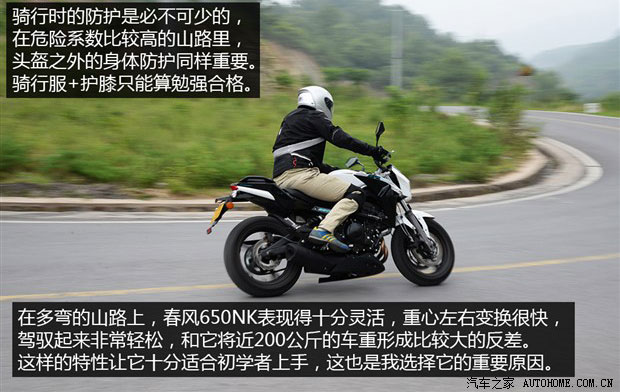 在經過一番了解和比較之后,我選擇了2014款春風650NK,它強勁而有爆發力的加速性能和靈活輕巧的操控是我最喜歡的地方。我認為BN600的幾個優勢,比如唬人的外形、四缸發動機的平順性還有排氣的聲浪,是我下一輛車才需要做的事,而那時我肯定會買一輛綜合表現更好、更成熟的國外品牌產品。