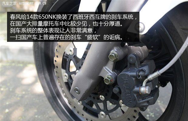 而我買的這輛14款春風650NK還有兩處比較實用的配置升級,首先是換裝了德國馬牌的輪胎,抓地力和極限表現到了一定的提升。另外,剎車系統也從原來的國產品牌升級成了西班牙西互品牌的剎車系統,前剎很靈敏一點就有,而且制動力比較均勻線性,手感比BN600明顯強出不少。