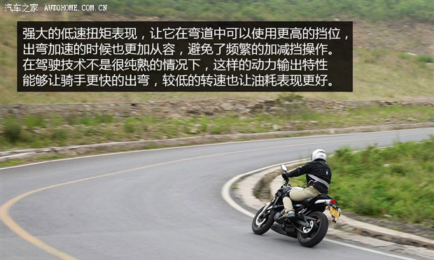 最值得稱道的就是它發動機的爆發力了,650cc的雙缸發動機70馬力(52千瓦)、62牛·米的動力輸出雖然不算搶眼,但低速扭矩非常充沛。在2000rpm左右就能輸出很強的力道,對于市區駕駛很有幫助,不需要頻繁的加減擋。而到了4000rpm左右還會有一個強有力的爆發,那種轉動右手隨之而來的沖勁是在絕大多數轎車和其它同級國產摩托車上體會不到的。