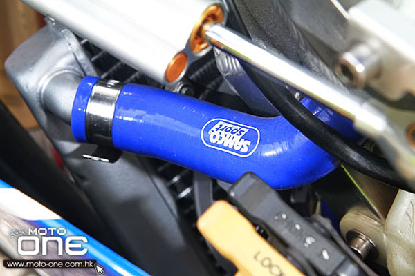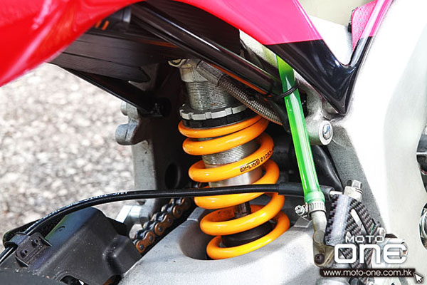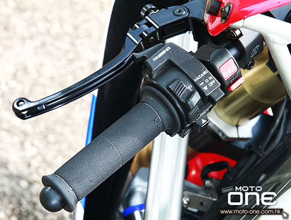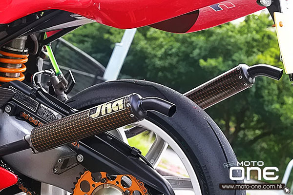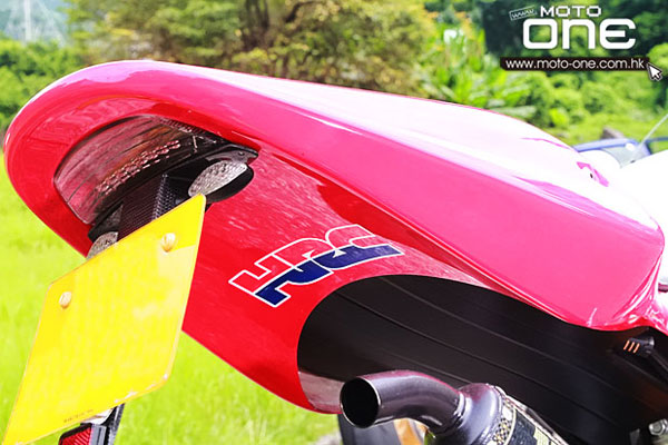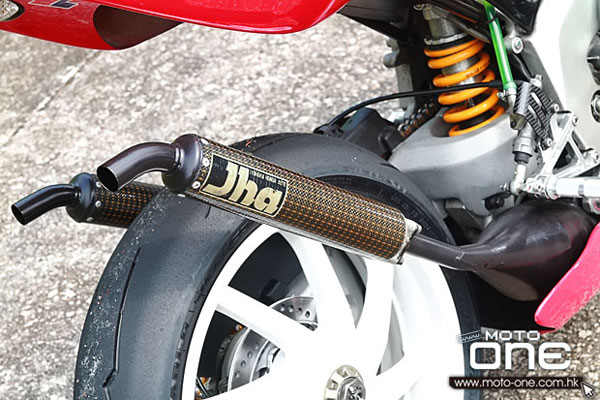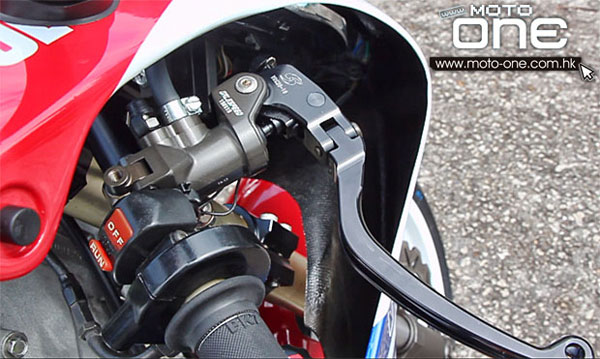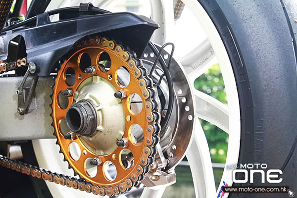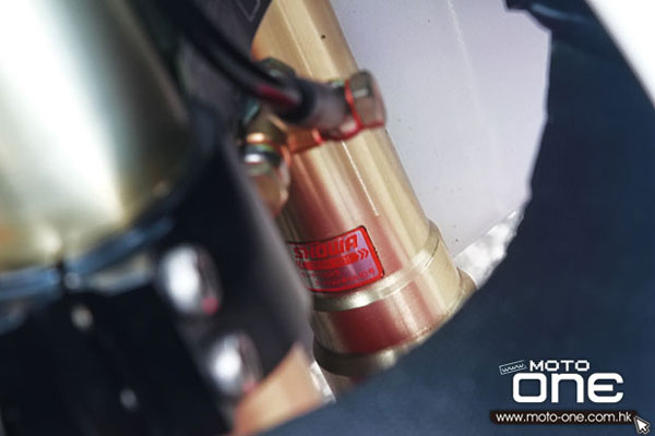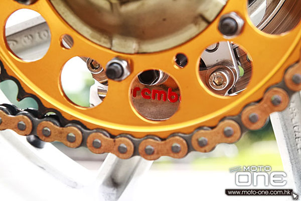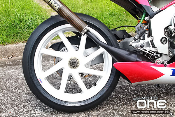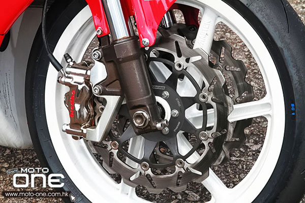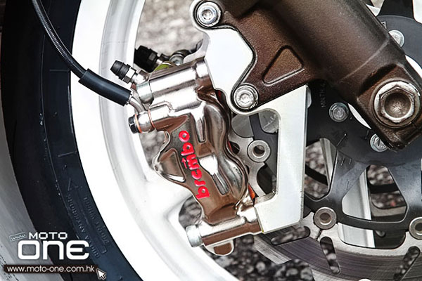 ●HonDA RFV400倒立前叉取代原裝正立前叉,車輛保留了原裝SP版輕量化鎂合金輪框,但改用了菊花煞車碟及BREMBO M50一體式鑄造煞車卡鉗。