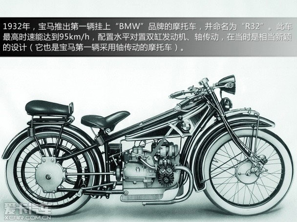 1923年,寶馬第一輛摩托車“R32”出現在世界上,它是寶馬第一輛采用軸傳動的寶馬摩托車,也是第一輛掛上藍白螺旋槳廠徽的摩托車。事實上,寶馬制造摩托車的歷史比起汽車還要長一些,寶馬一直到1932年時才制造出第一款屬于自己的汽車3/20PS。