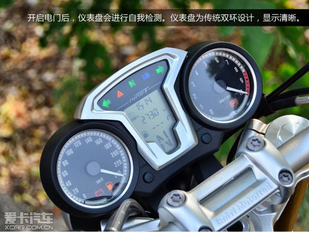儀表盤是傳統街車慣用的雙表配置,右邊為轉速表,左邊為時速表,不像現在很多摩托車都用數字速度表,行車電腦的切換按鍵就在左手處,儀表盤上還有兩組里程顯示切換的按鍵。信息顯示屏的外框用了銀色點綴,內含里程顯示、平均時速、平均油耗。不過,有個小地方讓人感到有點困擾,就是R nineT并沒有油量表,只有低油量警示而已,對于摩旅愛好者而言,出遠門時就要多注意油量了。