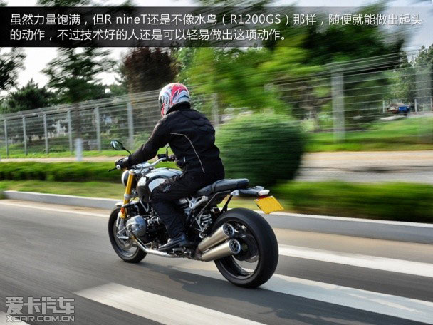 在八月的北京街頭,就算穿著騎行服還是能感受到腳邊所傳來陣陣熱風,這股熱量一直到高速行駛時還是能清楚地提醒你別忽視它的存在。不過與街上的汽車相比,R nineT就顯得輕巧許多,只要油門輕輕一轉,立刻就能擺脫旁邊的車陣,動力的平順性相當良好。在轉速達到3000rpm以上時,動力輸出讓人相當滿意,雖然轉速的提升不算非常迅速,但每一分轉速都能轉化為動力,鈦合金排氣管所發出清脆綿密的聲響時刻伴隨耳邊。另外,寶馬為它配置了電控的排氣閥門,讓騎士們都能體驗到美妙的排氣聲浪。