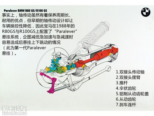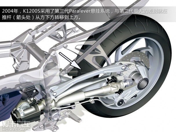 而最早的軸傳動懸掛系統被稱為“Monolever”,不像現在的Paralever懸掛系統后面還有一個“關節”,這套懸掛系統在做垂直運動時,也會造成旋轉運動。而Paralever懸掛系統除了在傳動軸上多加了一組“關節”,還加上了一組控制臂,后懸掛上下移動時,不會產生旋轉的現象。控制臂會保持搖臂與后輪之間的相對角度(懸掛的幾何形狀就像汽車的雙叉臂懸掛一樣),也由于這個“關節”接連動,旋轉的車輪對于懸掛的干擾會減低不少。根據研究,采用Paralever懸掛設計的R100GS,其后懸掛所產生的旋轉量為采用Monolever的一半。