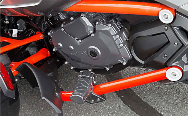 新款F3由去年在Spyder RT中引入的1330mL Rotax三缸發動機所驅動。RT的算法使得機車穩定控制系統(SCS)和牽引力控制系統(TCS)滿載,而F3的電子系統則不會這般負贅累累。當駕駛中做出怪異動作時,SCS和TCS都會在任何失控前介入。