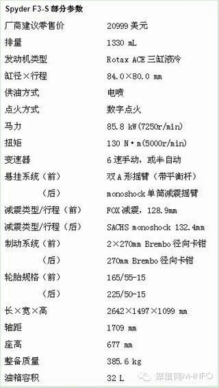 就像其它Spyder車型一樣,F3有兩個版本:售價19499美元的標準版和20999的F3-S版,1500美元的差價帶來的區別就是巡航控制、加工前輪、羊皮坐墊、集成LED照明的前擋泥板等等。兩者均配置手動或SE6半自動變速器,但標準版的離合器明顯比較僵硬,我個人更喜歡SE6半自動變速器,只需要用左手拇指按下按鈕就能升擋,可以選擇手動或自動降擋。SE6是價值1500美元的可選配件,但絕對物有所值。