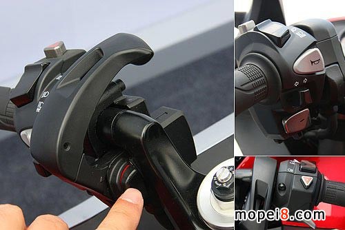 普通MT款VFR1200F和DCT款VFR1200F在外觀上看不出很大的區別,但在駕駛的操作過程中還是會讓你驚喜連連。普通MT款VFR1200F的駕駛操作和以往的大排量摩托車是一樣的。但是DCT款VFR1200F就會讓你體驗到本田勇于創新、以人為本的設計理念。DCT款的VFR1200F左側沒有換檔桿和離合小把,取代換擋桿的是在左手把上的兩個小按鍵上面分別標志著+和—也就是在手動模式的時候加減檔。而右手把上就多了一個組合按鈕,N表示空擋D表示前進擋S表示運動檔。還有一個AT和MT的切換開關,可以在駕駛過程中自由切換。D擋和S擋也可以在行進過程中變換讓駕駛變得如此簡單。即使是長途跋涉,也不會過于疲憊