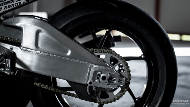 RonAX 500 使用電子噴射的二行程500cc 80度夾角V4 引擎,最大馬力為160hp/11,500rpm,干重只有145kg。全車整流罩為碳纖維材質(zhì),使用Ohlins 43mm 倒叉與Ohlins TTX 后懸吊,制動也是高規(guī)格的前Brembo 鍛造鋁合金對四卡鉗與320mm 浮動碟,后Brembo 鍛造鋁合金對二卡鉗與210mm 碟盤。為了能在公路使用,也配有照后鏡與LED 頭燈,當(dāng)然從外型來看,很明顯是為了「合乎規(guī)范」才加上去,還是只有將道路設(shè)備全部拆掉的賽道仕樣才是最對味。