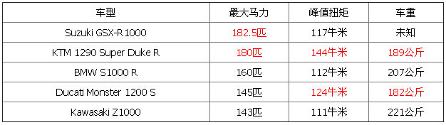不過(guò)與目前市面上當(dāng)紅的KTM 1290 Super Duke R、BMW S1000 R、Ducati Monster 1200 S,以及Kawasaki Z1000這幾款頂級(jí)街車相比,GSX-S1000的賬面數(shù)據(jù)還較有優(yōu)勢(shì),如果量產(chǎn)車型能夠延續(xù)這一數(shù)據(jù),市場(chǎng)方面后來(lái)居上的可能非常大!