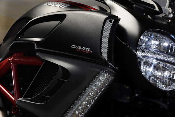 Diavel Carbon 魔鬼碳纖版車款精致的鍛造鋁制配合 Marchesini 車輪將摩托車的重量降至 205 千克。具有鉆石般外殼 (DLC) 的 Marzocchi 前叉,銑削鋁制的剎車盤座,碳纖維整流罩和黑色配件;所有這些使魔鬼碳纖版設計成為獨具特色的技術工藝神奇結合。