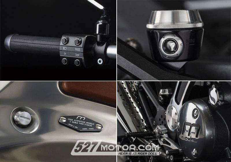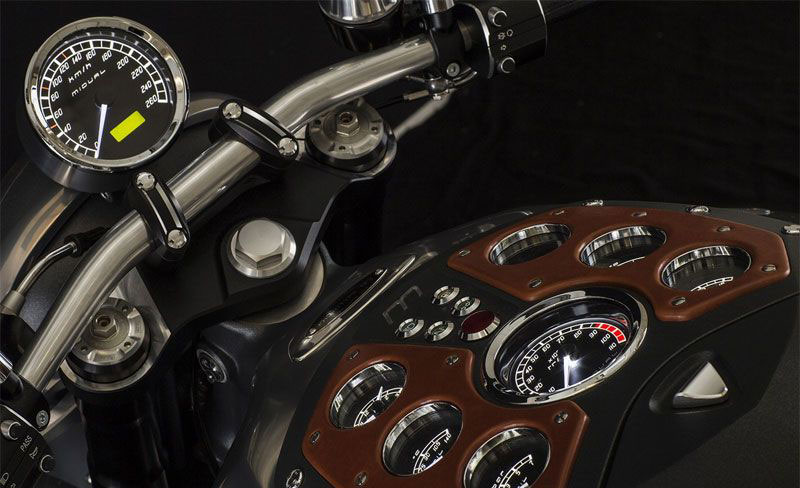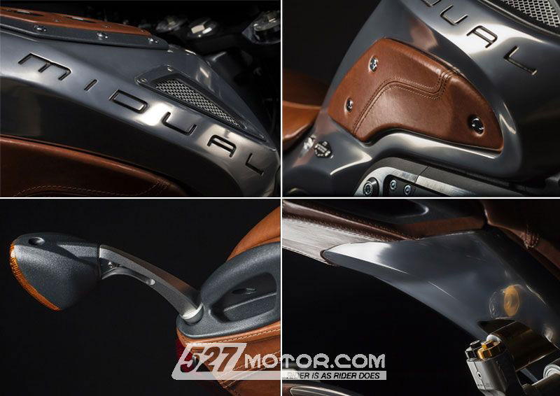 儀表盤位于油箱頂部,一大六小的表盤不僅將所有信息囊括其中,而且拋光的實木表板有多種顏色可供更換,與真皮坐墊、油箱防滑墊交相輝映,質感一流。此外,Midual Type 1車身的其它部件配置也都是奢華好料,Brembo、Ohlins都只是標準配置。