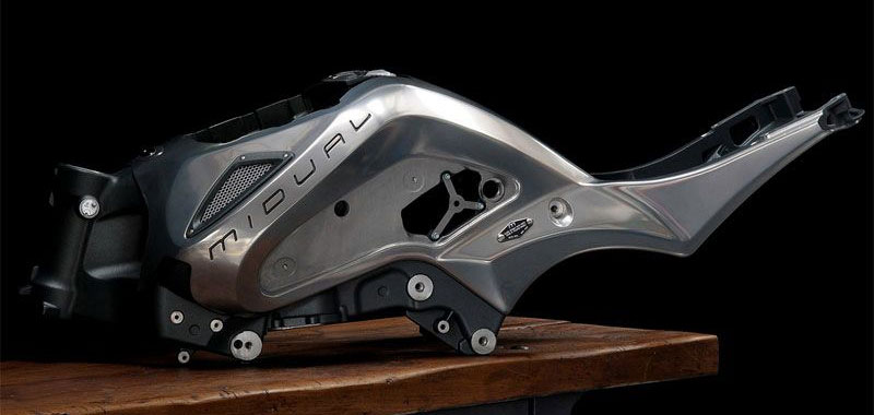 另外一個值得稱道的便是它的車架,Type 1的車架與油箱是一體鑄造而成,且表面進行了拋光,金屬質感一流,一體鑄造的車架將14升的油箱包覆其中,功能類似于汽車中的承載式車身。