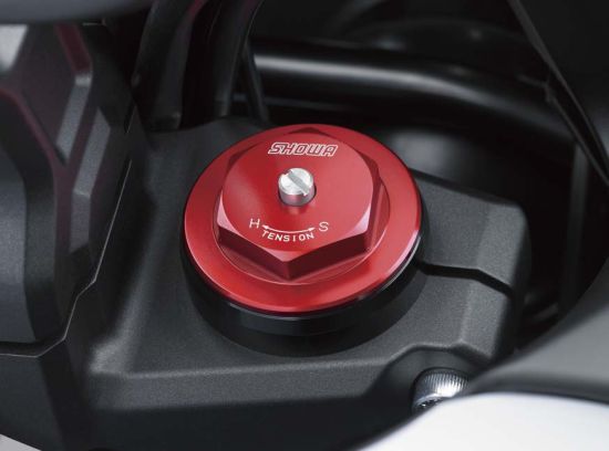 后減震可自行調整阻尼,讓車輛適應不同的裝載設定。比如:單人或雙人模式,掛邊箱與不掛邊箱設置,以對應不同的裝載情況。讓車輛的操控性在任何狀態都達到完美。