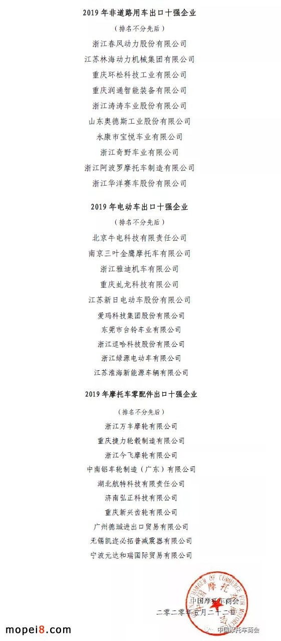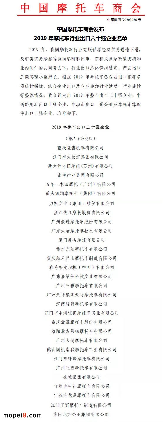 5月22日,根據2019年摩托車各企業出口額等多項統計指標,綜合企業出口及企業參加行業活動、行業建設等整體情況,中國摩托車商會評定出2019年整車出口三十強企業、非道路用車出口十強企業、電動車出口十強企業及摩托車零配件出口十強企業。