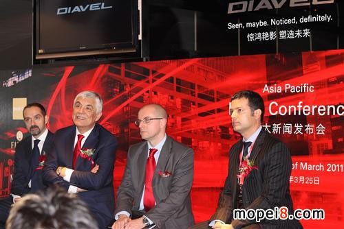 此次Diavel亞太發布系列活動,于3月25日下午拉開帷幕:Diavel新聞發布會在新近開張的Ducati Caffe內舉行。杜卡迪公司CEO及執行總裁Gabriele Del Torchio 先生,商務總監Cristiano Silei先生,以及品牌及服飾經理Lucio Attina先生,向與會的35位中國記者及15位亞太區媒體記者,詳細詮釋了Diavel的設計理念及功能特性。Diavel新聞發布會著力于向亞太區的行業類媒體,介紹杜卡迪最新款摩托車的諸多特性。而杜卡迪公司多位高層的現場參與,則體現了公司對于亞太市場的看重。