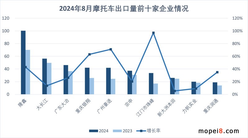 1-8月,摩托車出口量排名前十位的企業依次為:隆鑫、大長江、廣東大冶、重慶銀翔、廣州豪進、宗申、江門市珠峰、新大洲本田、力帆、潤通,上述十家企業共出口422.75萬輛,占摩托車出口總量的59.6%。