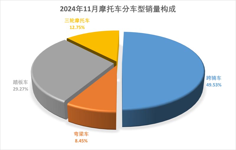 1-11月,跨騎車產(chǎn)銷902.87萬(wàn)輛和899.78萬(wàn)輛,同比增長(zhǎng)22.23%和20.97%;踏板車產(chǎn)銷525.8萬(wàn)輛和531.74萬(wàn)輛,同比下降27.95%和22.49%;彎梁車產(chǎn)銷155.91萬(wàn)輛和153.43萬(wàn)輛,同比增長(zhǎng)8.26%和6.11%。從各車型銷量占二輪車總銷量的比重看,跨騎、踏板和彎梁三類車型占比分別為56.78%、33.35%和9.68%。23%、34.17%和9.6%。