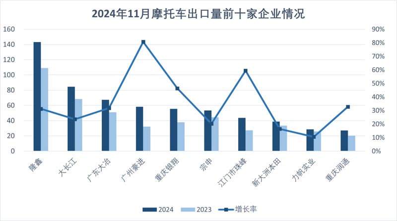 1-11月,摩托車出口量排名前十位的企業(yè)依次為:隆鑫、大長(zhǎng)江、廣東大冶、廣州豪進(jìn)、重慶銀翔、宗申、江門(mén)市珠峰、新大洲本田、力帆、潤(rùn)通,上述十家企業(yè)共出口600.67萬(wàn)輛,占摩托車出口總量的60.29%。