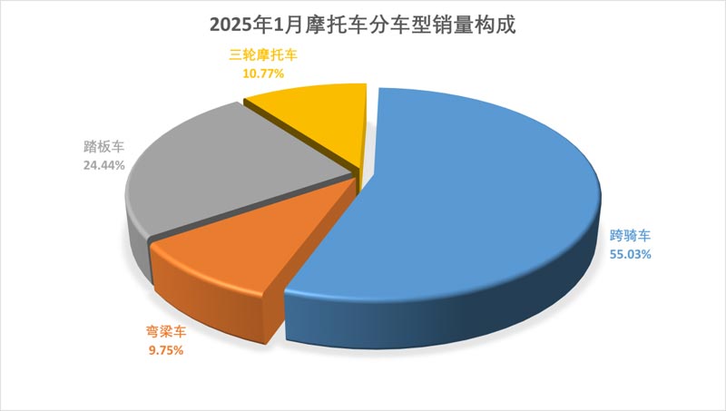 1月,從車型明細來看,三大車型中,跨騎車產銷88.26萬輛和87.91萬輛,產銷量環比下降7.7%和6.12%,同比增長16.09%和13.8%;踏板車產銷38.49萬輛和39.05萬輛,產銷量環比下降12.18%和5.84%,同比下降15.57%和14.91%;彎梁車產銷14.01萬輛和15.58萬輛,產銷量環比下降21.89%和7.18%,產量同比下降9.16%,銷量同比增長6.3%。從各車型銷量占二輪車總銷量的比重看,跨騎、踏板和彎梁三類車型占比分別為61.68%、27.39%和10.93%。