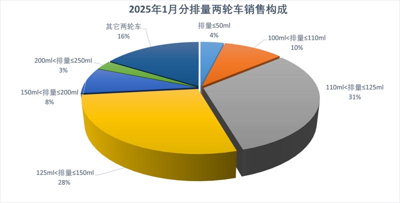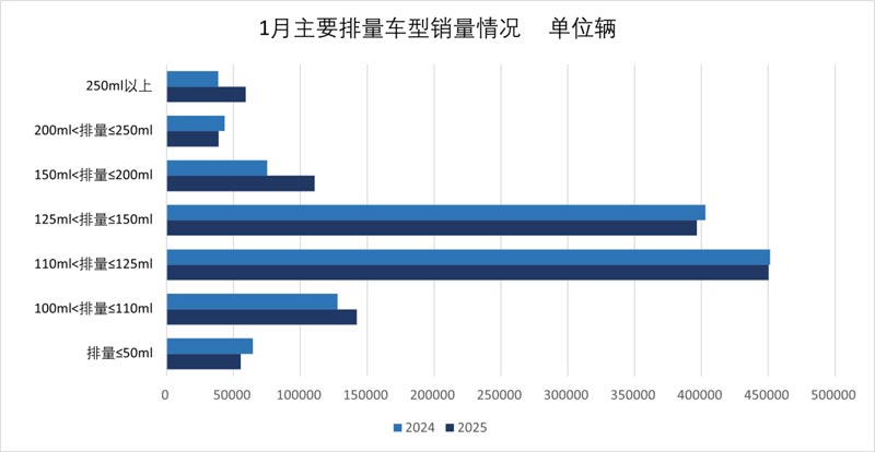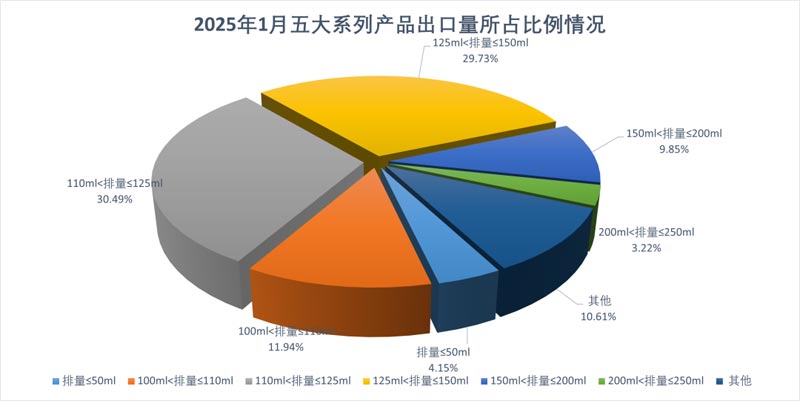 1月,出口量位居前六位的系列品種為:125系列(110ml<排量≤125ml)、150系列(125ml<排量≤150ml)、110系列(100ml<排量≤110ml)、200系列(150ml<排量≤200ml)、50系列(排量≤50ml)和250系列(200ml<排量≤250ml),分別出口31.72萬輛、30.93萬輛、12.42萬輛、10.24萬輛、4.32萬輛、3.35萬輛。與去年同期相比,125系列增長12.79%,150系列下降2.12%,110系列增長22.58%,200系列同比增長70%,50系列下降7.56%,250系列增長25.23%。