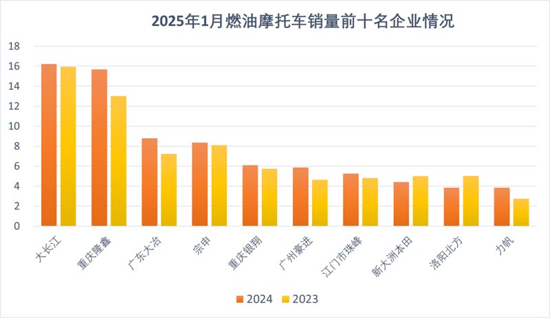 1月,燃油摩托車銷量前10名企業(集團)為大長江、隆鑫、廣東大冶、宗申、重慶銀翔、廣州豪進、江門市珠峰、新大洲本田、洛陽北方、力帆,分別銷售摩托車16.21萬輛、15.67萬輛、8.78萬輛、8.35萬輛、6.1萬輛、5.87萬輛、5.25萬輛、4.42萬輛、3.85萬輛、3.84萬輛,10家企業共銷售摩托車72.85萬輛,占摩托車總銷量的56.98%。